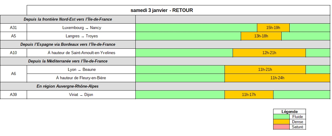 Samedi 3 janvier, dans le sens des retours, une circulation importante est attendue sur les axes du quart Nord-Est, de la fin de la matinée jusqu’en début de soirée selon les secteurs. Les principales difficultés devraient concerner les autoroutes A5, A6, A31 et A39.
