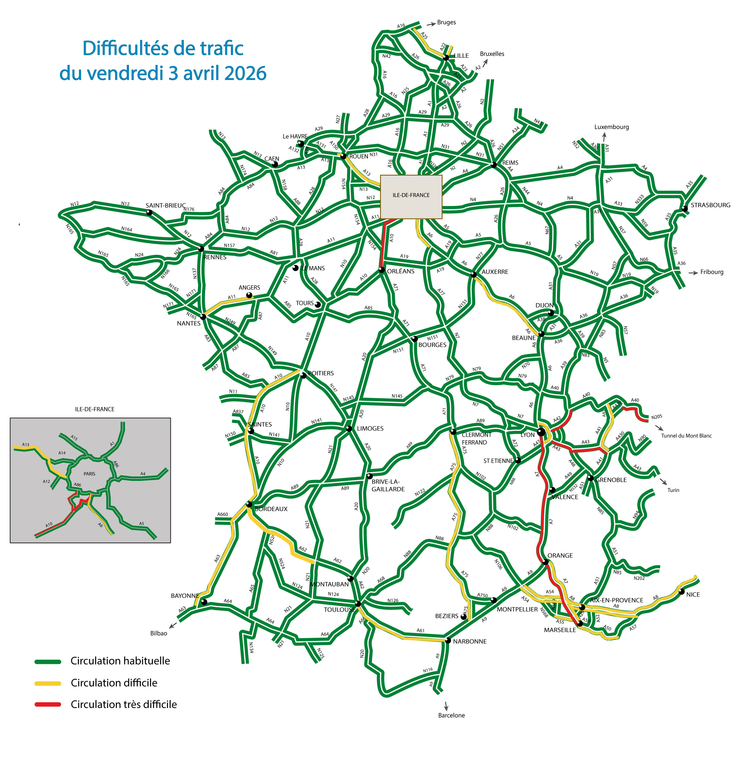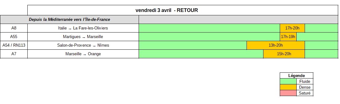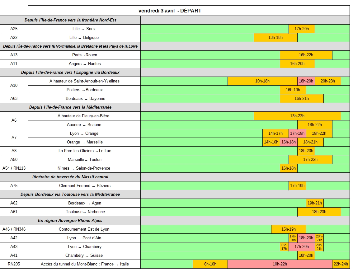 Vendredi 3 avril, dans le sens des départs, des difficultés de circulation sont attendues sur l’ensemble des grands axes. Les usagers seront nombreux en direction de la côte normande (A13), de la côte atlantique (A10, A11, A63). Mais les encombrements les plus importants pourraient être constatés sur les routes desservant la côte méditerranéenne (A7, A8, A50, A61) et la région Auvergne-Rhône Alpes (A41, A42, A43 et l’accès au tunnel du Mont-Blanc). Ils devraient apparaître en début d’après-midi et pourraient se poursuivre jusque tard dans la soirée. En Ile-de-France, dès la fin de la matinée, le trafic deviendra très dense en direction des barrières de péage des autoroutes A10 et A6 ainsi que sur les autoroutes qui y convergent. En milieu d’après-midi, l’augmentation du trafic sur les autoroutes A10 et A6, conjuguée aux trajets pendulaires, pourrait entraîner des difficultés de circulation persistantes jusqu’en début de soirée. Par ailleurs, l’autoroute A13 pourrait connaître des ralentissements dès le milieu de l’après-midi.