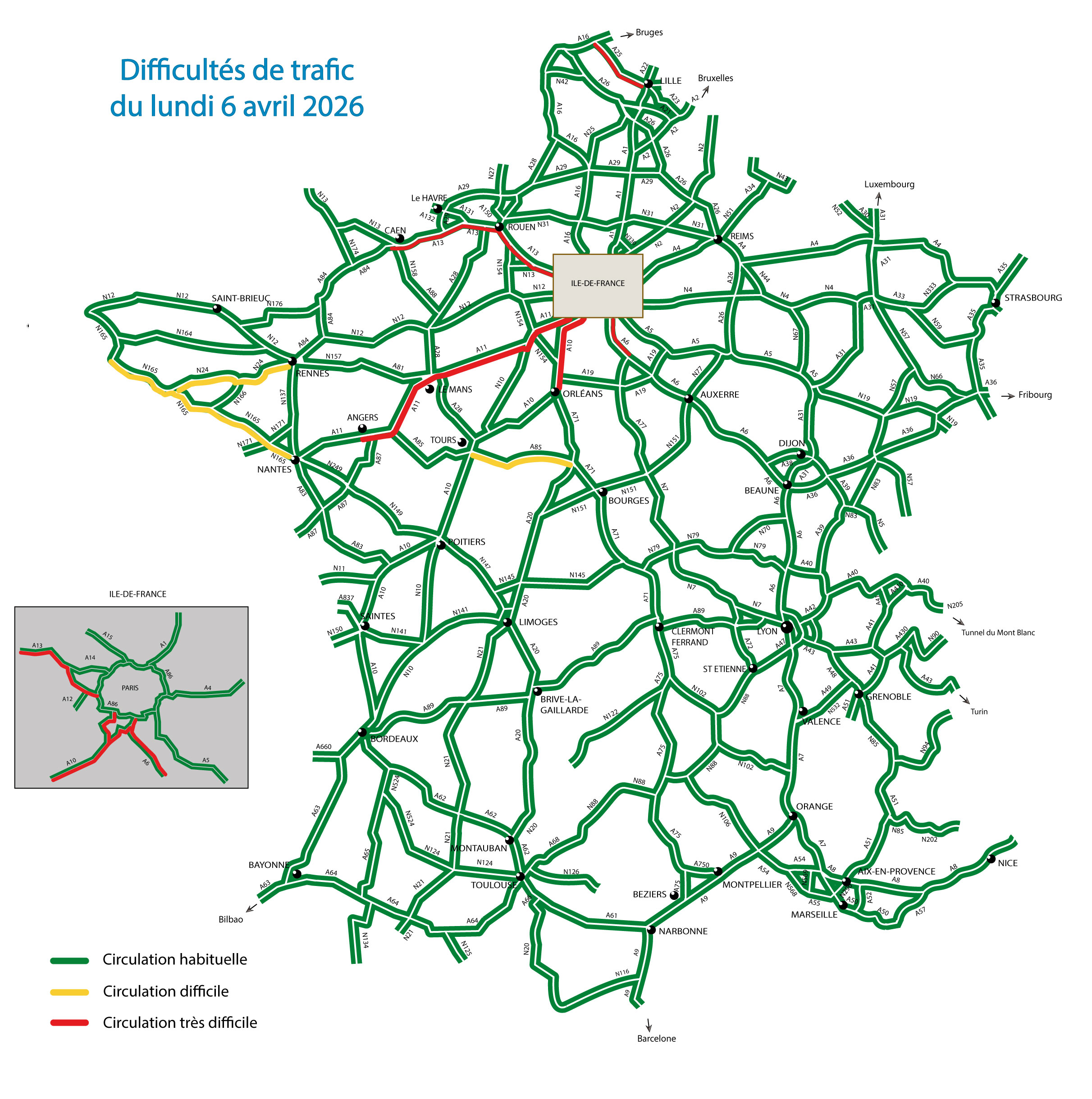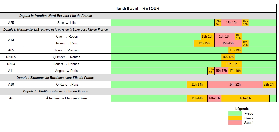 Lundi 6 avril, dans le sens des retours, il sera particulièrement difficile de circuler sur les routes du quart Nord-Ouest. Les axes au départ de la côte atlantique (A11, RN24, RN165), de la côte normande (A13) et du Nord (A25) devraient être très fréquentés, principalement du début de l’après-midi et jusqu’en début de soirée. En Île-de-France, dès la fin de matinée, la circulation sera dense sur les autoroutes A10 et A6. Des difficultés de circulation ou des ralentissements seront enregistrées tout le long de l’après-midi et pourraient être encore présentes jusque tard dans la soirée (essentiellement sur l’A10). L’autoroute A13 pourrait également enregistrer des difficultés de circulation, dès le milieu d’après-midi et pouvant perdurer jusque tard dans la soirée.