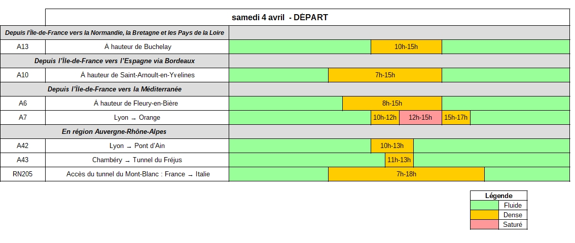 Samedi 4 avril, dans le sens des départs, les principaux bouchons de la journée devraient se concentrer sur la région Auvergne-Rhône-Alpes, notamment sur les autoroutes A7, A42 et A43 et pour l’accès au tunnel du Mont-Blanc. En Île-de-France, on pourra observer une circulation dense sur les autoroutes A10 et A6 dès le début de la matinée. Les encombrements devraient nettement s’intensifier à partir du milieu de la matinée et rendre difficile la circulation sur ces axes jusqu’en milieu d’après-midi. Des difficultés de circulation pourraient également être enregistrées sur l’autoroute A13 entre le milieu de la matinée et le début de l’après-midi.