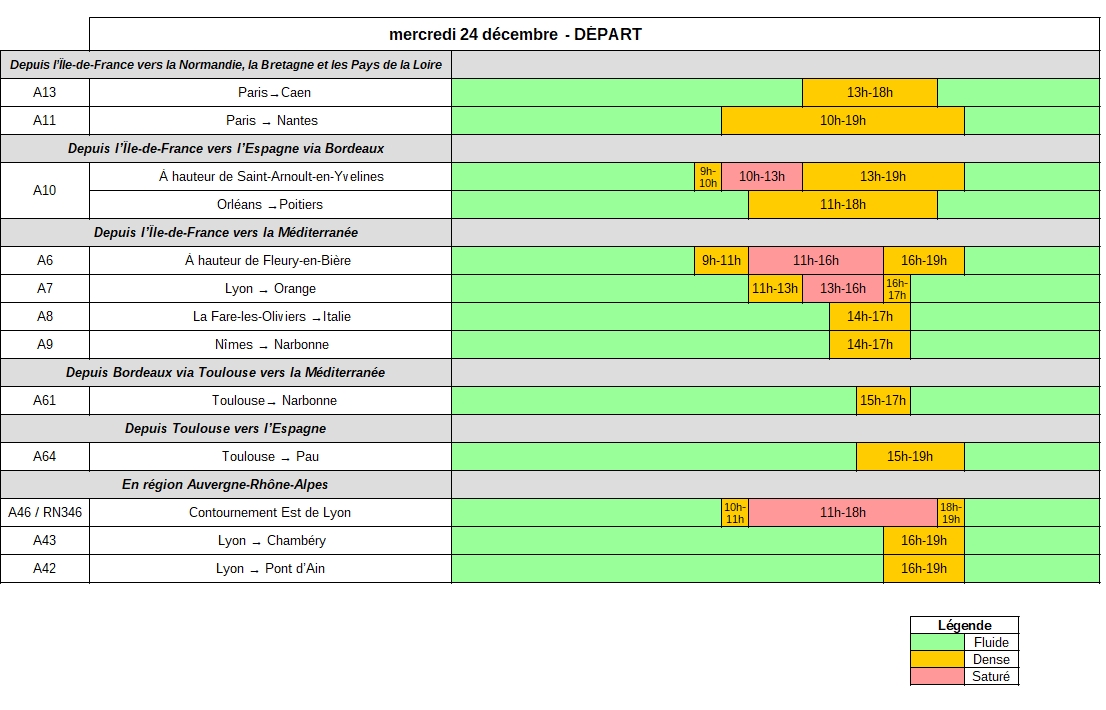 Mercredi 24 décembre sera l’une des journées les plus chargées où la demande de déplacement sera la plus importante sur la période. Dans le sens des départs, le niveau de trafic devrait être très élevé dès le début de la matinée et jusqu’en début de soirée. Les niveaux de trafic pourront être particulièrement importants en direction de la côte normande (A13), de la côte atlantique (A10, A11), en région Auvergne-Rhône-Alpes (A7, contournement Est de Lyon, A42, A43) et sur les axes desservant l’arc méditerranéen (A8, A9). En Île-de-France, les déplacements seront nombreux dès le milieu de la matinée. La combinaison des nombreux déplacements liés aux derniers préparatifs du réveillon de Noël, aux trajets pendulaires et aux trajets vers les lieux des festivités, pourrait rendre la circulation très intense sur l’ensemble de l’Île-de-France jusqu’en début de soirée.