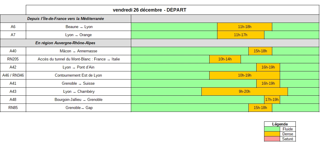 Vendredi 26 décembre, dans le sens des départs, le niveau de trafic en région Auvergne-Rhône-Alpes pourrait être particulièrement élevé, et tout particulièrement sur les autoroutes A7, A40, A41, A42, A43 et A48, ainsi que sur le contournement Est de Lyon (A46/N346) et l’accès au tunnel du Mont-Blanc (N205) depuis le milieu de la matinée, jusqu‘en début de soirée.