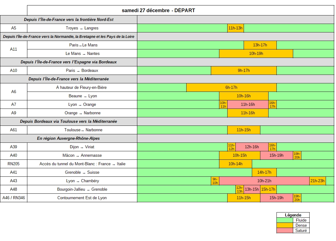 Samedi 27 décembre, dans le sens des départs, Les niveaux de trafic seront élevés dès le la début de la matinée jusque tard dans la soirée, en particulier en région Auvergne-Rhône-Alpes. Les axes desservant la côte atlantique devraient connaître des niveaux de trafic importants (A10, A11), tout comme ceux de la région Auvergne-Rhône-Alpes où une circulation très dense est attendue sur les autoroutes A7, A39, A40, A43 et A48, ainsi que sur le contournement Est de Lyon (A46/N346) et l’accès au tunnel du Mont-Blanc (N205). La circulation devrait être également très importante en direction de la côte méditerranéenne (A8, A9 et A61). En Île-de-France, les usagers devraient être nombreux dès le début de la matinée et devraient rendre la circulation difficile jusqu’en fin d’après-midi.