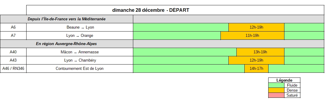 Dimanche 28 décembre, dans le sens des départs, la région Auvergne-Rhône-Alpes devrait connaitre une importante circulation dès la fin de la matinée, jusqu’en début de soirée (A6 depuis Beaune, A7, A40, A43, contournement Est de Lyon).