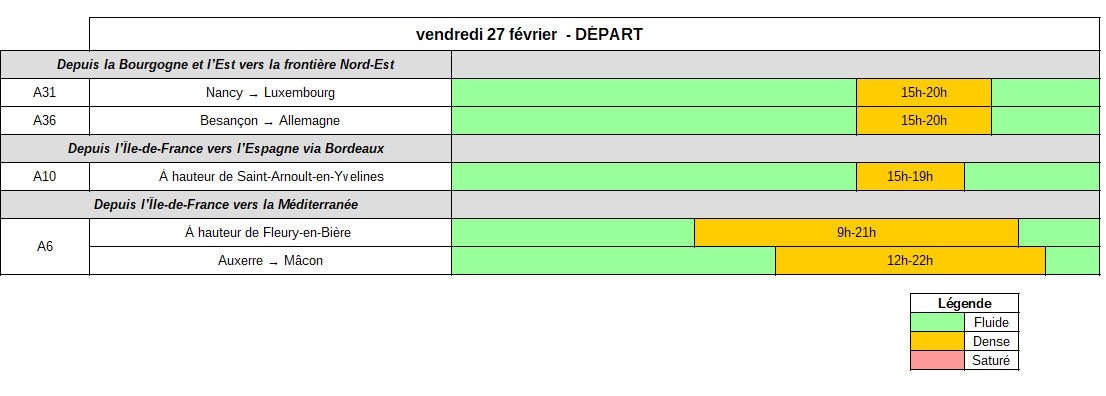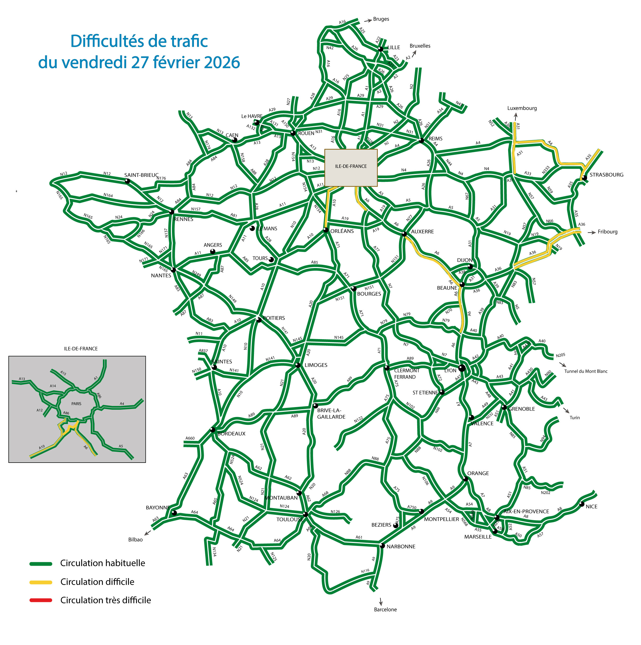 Vendredi 27 février, dans le sens des départs, les routes desservant le quart Nord-Est devraient être très sollicitées (A6, A31, A36), du début de l’après-midi jusqu’en début de soirée. En Île-de-France, les premiers ralentissements devraient apparaître dès le milieu de la matinée sur l’autoroute A6 entre l’échangeur avec l’A86 et le péage de Fleury-en-Bière, et se poursuivront jusqu’en soirée. En milieu d’après-midi, les flux de trafic correspondant aux trajets pendulaires renforceront ces difficultés. Dans le sens des retours, les usagers devraient être nombreux sur les axes provenant des frontières de l’Est (A4, A35, A36), du milieu de l’après-midi et jusqu’en début de soirée.