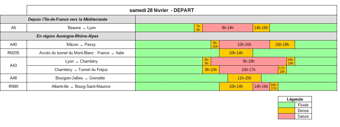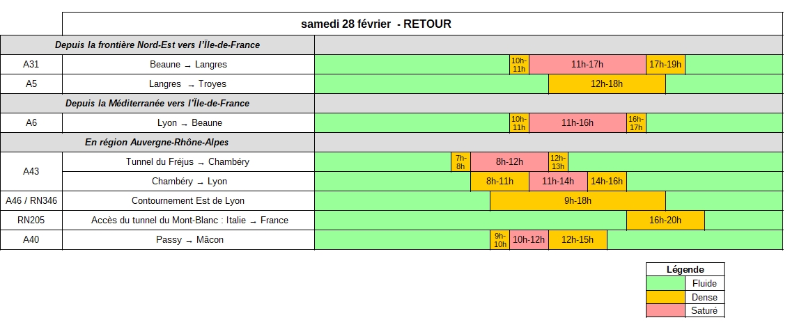 Samedi 28 février, dans le sens des départs, la journée devrait être particulièrement difficile en direction de la région Auvergne-Rhône-Alpes. La circulation devrait être très dense sur les autoroutes A6, A40, A43 et la RN90, depuis le début de la matinée et jusqu’en début de soirée. Dans le sens des retours, des encombrements très importants sont attendus en région Auvergne-Rhône-Alpes (A40, A43, A46) en Bourgogne et dans l’Est (A5, A31, A6), du début de la matinée, jusqu’en début de soirée.