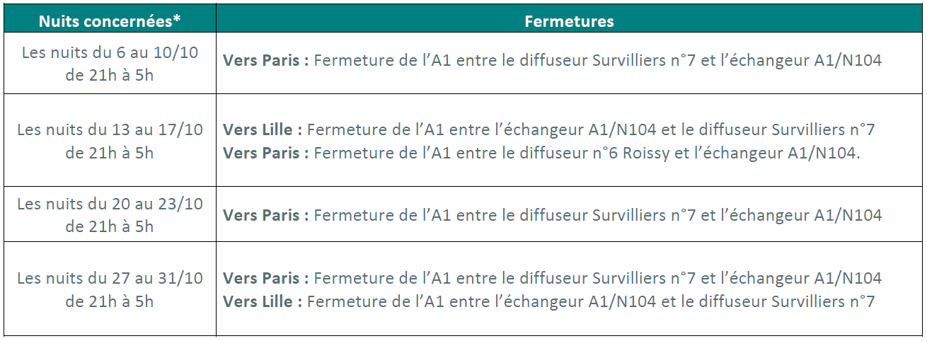 • Durant plusieurs nuits en octobre, l’A1 sera fermée entre les diffuseurs de Roissy n°6 et de Survilliers n°7.